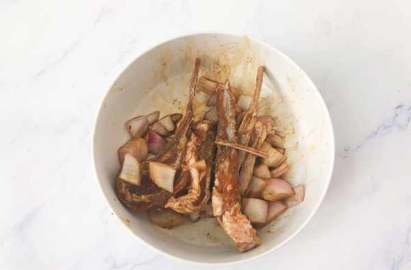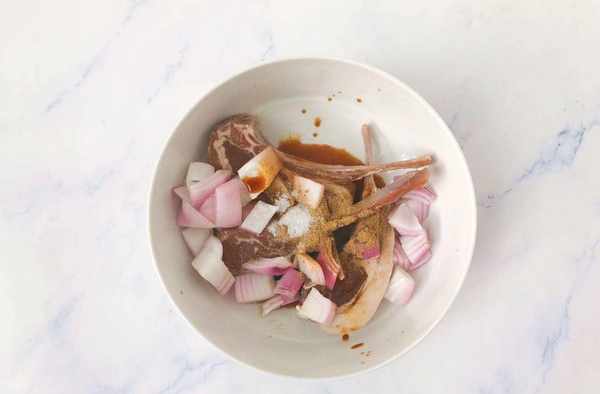 2. 羊排放入碗中,加入切好的洋葱、生抽、十三香和盐。