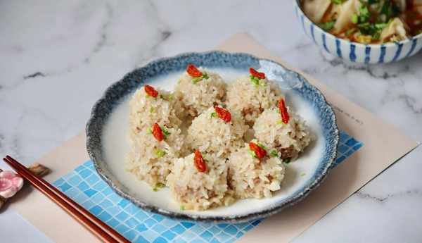 食材:猪肉、糯米、莲藕、姜末、葱末、鸡汁、酱油、盐、枸杞、香葱