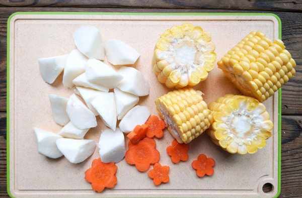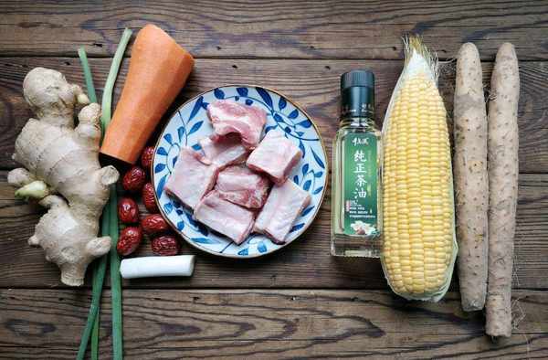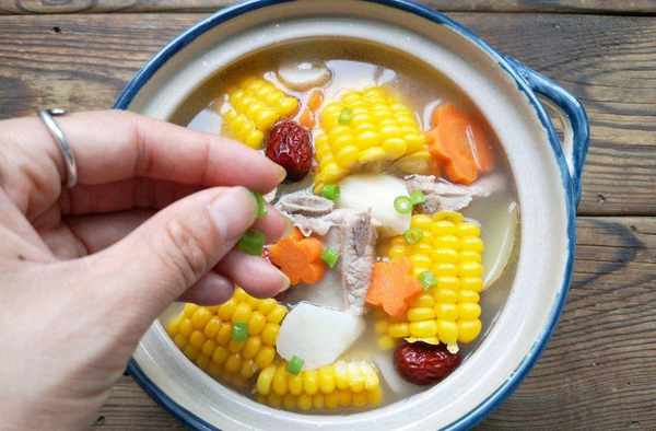 食材:排骨、玉米、山药、胡萝卜、红枣、葱白、姜、小葱、盐
