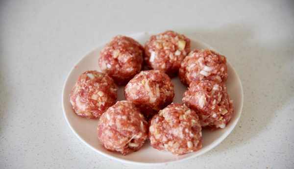 2.除了糯米后,将所有调料和配菜全都放到肉馅中,之后朝一个方向搅拌均匀,之后分成8小份,依次揉成球。