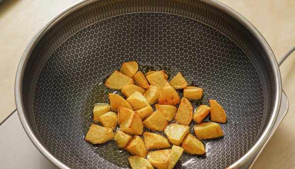 2.玉米和藕片冷水下锅,等煮熟后在捞出来,土豆放到油锅中炸到金黄盛出来备用。