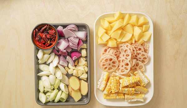 1.将食材准备出来,大虾剪去虾腔,开背去除虾线,这样能更入味。莲藕去皮切片,土豆去皮切块,玉米、洋葱切块,大葱切段、姜蒜切片、辣椒切段。