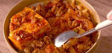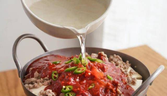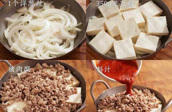 4、锅中放入1个切丝的洋葱,350g切成1.5cm厚片的老豆腐,再倒入猪肉糜和调好的料汁,撒上半勺线椒片,加入500g清水,大火烧开后,转小火3-5分钟煮至汤汁浓稠即可。