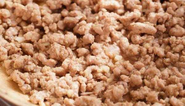 3、在平底锅中加入1勺食用油,中火炒猪肉糜2-3分钟,炒至变色捞出备用。