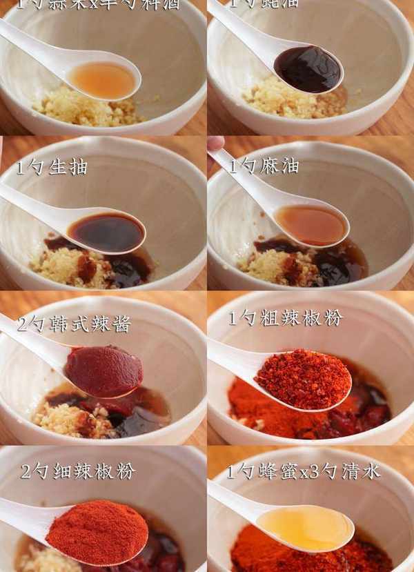 1、先调个料汁:1勺蒜末,半勺料酒,1勺蚝油,1勺生抽,1勺麻油,2勺韩式辣酱,1勺粗辣椒粉,2勺细辣椒粉,1勺蜂蜜和3勺清水搅匀。