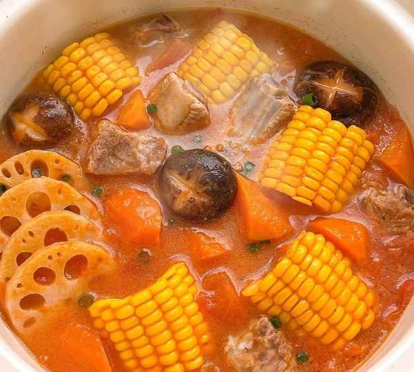 4、加入香菇,玉米,莲菜,胡萝卜,少许盐,煮15分钟,出锅前撒上葱花,美味即成。