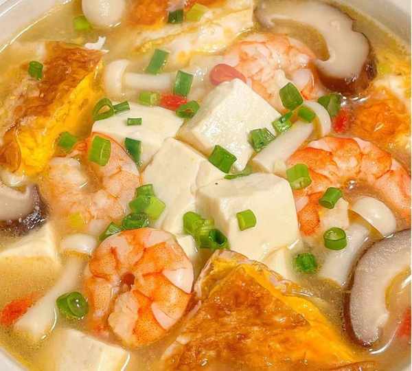 1、准备新鲜虾去壳去虾线,香菇洗净切片,白玉菇切根洗净,嫩豆腐切块,葱切葱花,枸杞几颗洗净备用;