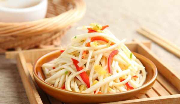 1.将茭白削去外皮,切去老根,洗净后纵切成两半,用刀背稍拍一下,使其质地变松软,放入开水锅中烫约10分钟后捞出,冷却后,用刀切成片或滚刀块,或是切成条、段,放在盘内。