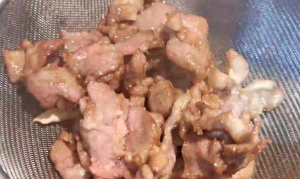 3.烧一锅油,八成热时倒入羊肉,快速搅拌,油炸5分钟后捞出,沥干油备用。