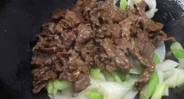 4.锅内放油烧至入盛热,放入大葱段,再放入牛肉片,加适量生抽、胡椒粉,开大火翻炒均匀就做好了。
