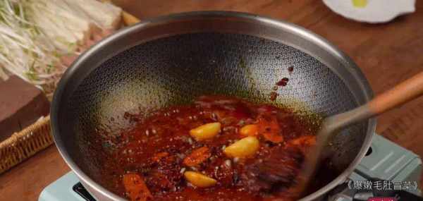 先来炒个底料,姜蒜爆香,然后下火锅底料和豆瓣酱炒出红油~