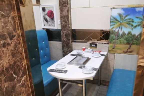這家燒烤店也和錦州絕大部分的燒烤店一樣,門口擺著一塊巨大的石頭,上面刻著"錦州非物質文化遺產:錦州燒烤"兩行大字。據他所說,他在網上看見過這家燒烤店,來了錦州又不能不嘗嘗聞名國內的"錦州燒烤",便决定前去探一探"廬山真面目"。進了這家萬年裏的分店,映入眼前的並不是多麼高大上的殿堂,而是十分狹窄的過道,兩旁則堆滿了簡易的包廂。但生意倒是紅火,顧客非常多。據聞,樓上還有一層,有帶門的包廂,但已經坐滿了。於是我們只能選擇一樓的散臺坐了下來。