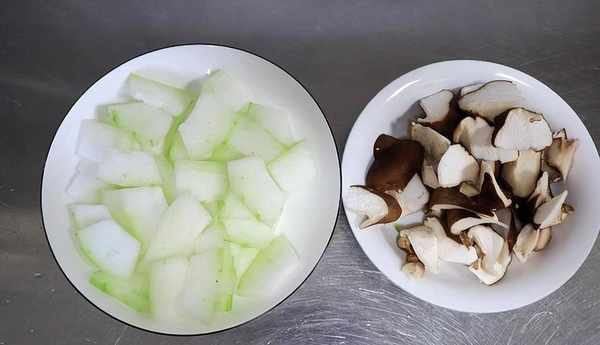 食材准备:水发香菇30克,冬瓜块80克,鸡肉块50克,瘦肉块40克,高汤适量。