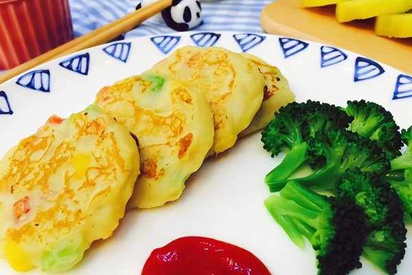 食材准备:西兰花20克、土豆160克、彩椒20克、面粉、植物油、盐。