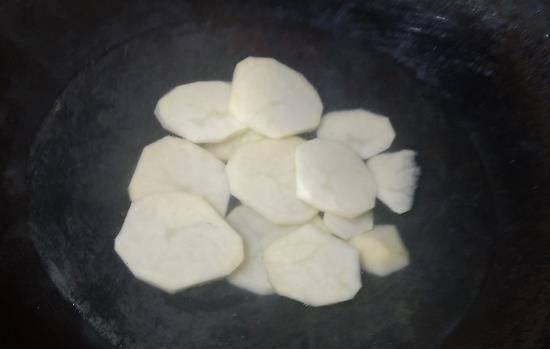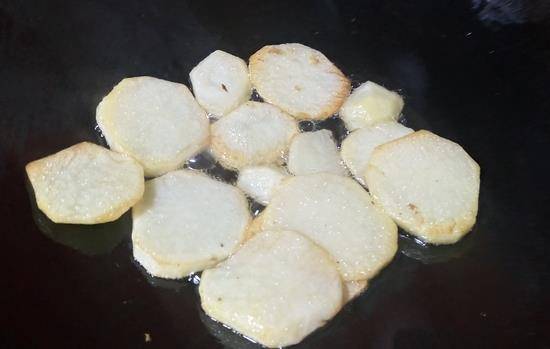 4、锅中放入油,把土豆片放入煎至两面金黄,然后再装盘待用。