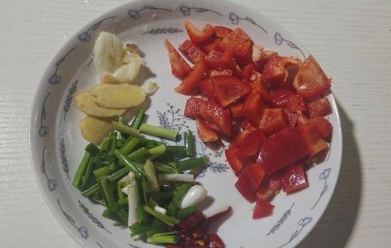 2、红椒切成小块状,葱白切成段,青蒜用刀背拍一下,然后切斜刀切,生姜切片 ,干辣椒切段,蒜瓣拍扁 。