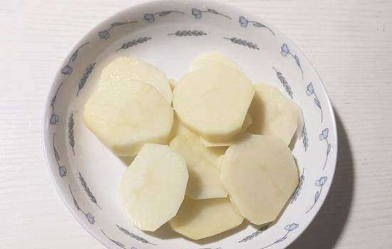 1、土豆去皮后切成厚片,切成圆形的厚片。