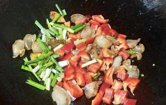 5、把生姜片下锅爆香,蒜片下锅,切好的肉片也倒进锅中,把水份煸炒出来,来少许的老抽上色,加入花椒,干辣椒,还有淋入少许的料酒,给土豆肉片增香,麻油豆瓣酱,葱段,红椒片。