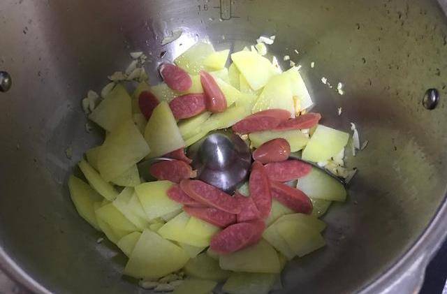 5、放入焯过水的土豆片、切好的火腿片,如图所示。