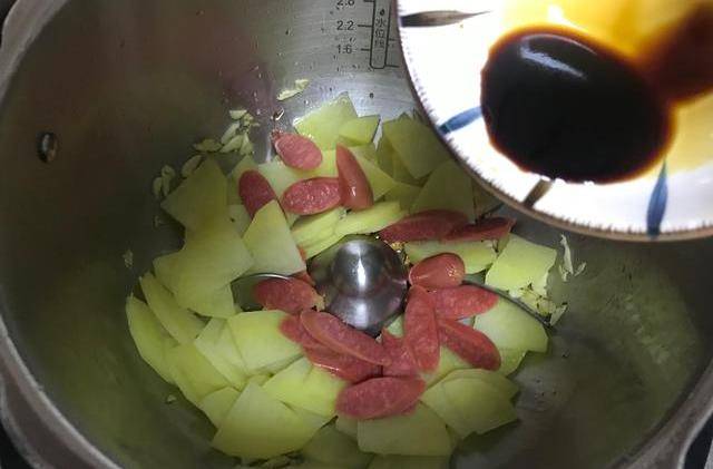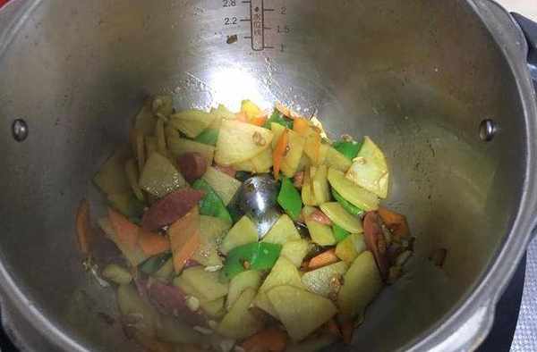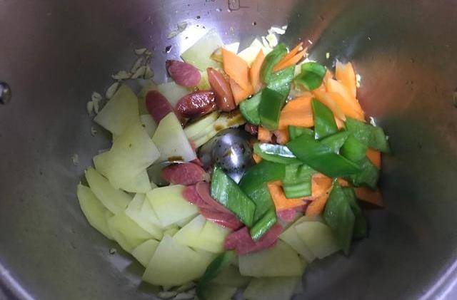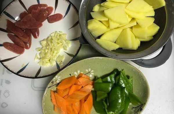 食材用料:土豆250克、火腿肠50克、胡萝卜50克、青椒50克、大蒜3瓣、生抽5克、蚝油5克、盐2克、食用油30克、水500克