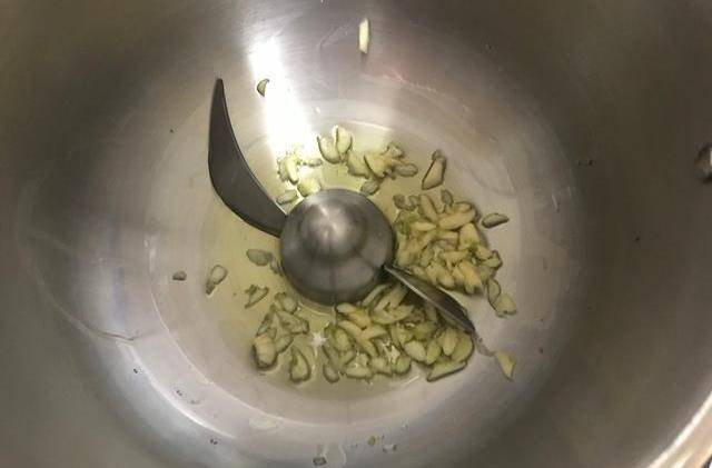 4、锅中倒入食用油,将其蒜末进行爆香,如图所示。