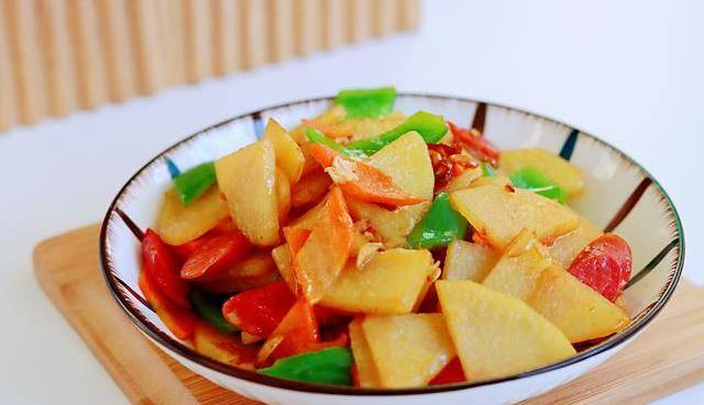 天气开始冷了,正式进入了冬天,那么今天就来同大家一起分享一款适合入冬后吃的美食吧,它就是我们生活中最常见的土豆,说起土豆,它的营养可是非常丰富,写信维生素和钙、钾等微量元素,易于消化吸收,能供给人体大量的热能。同样土豆中还含有大在量淀粉及蛋白质、B族维生素、维生素C等,能促进脾胃的消化功能,可以起到养胃的作用呢。不仅如此,土豆中所含的钾能取代体内的钠,同时能将钠排出体外,有利于高血压和肾炎水肿患者的康复,起到利水消肿的作用,这次用土豆搭配火腿、青椒、胡萝卜来做一道菜,不仅口感非常好,真的是营养太丰富了,所以入冬,这菜一定要多吃,别错过哟。