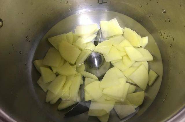 2、土豆切片,不要切得太薄,以免焯水后直接烂了,影响口感,切成厚片即可,具体焯水时间也要根据土豆切片状态灵活操作。