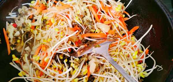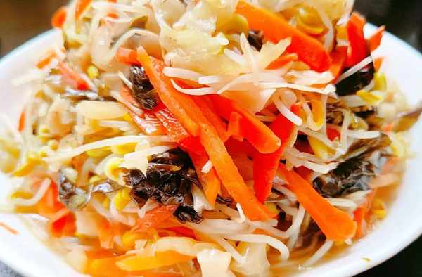 2,起锅烧油,油热后放入切好的雪菜翻炒一会,倒入黄豆芽翻炒断生,再倒入胡萝卜丝翻炒一会,如果感觉有点淡,可以加入少许盐,翻炒均匀,即可出锅装盘上桌了。