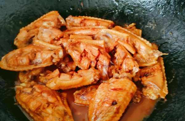 3,起锅烧油,油热后,该中火,放入翅中,煎至两面金黄,放入姜丝,倒入适量的红烧酱油和盐翻炒均匀,倒入适量的清水,水量和翅中持平,大火烧开,转中火慢炖,中途翻动几次,待汤汁浓稠,倒入适量的味极鲜翻炒一会,即可出锅装盘食用。