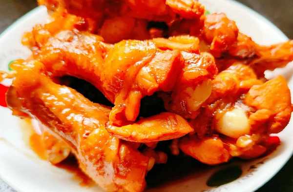 3,将腌制过的翅根连带酱油及姜丝等腌料一起倒入锅中,加入适量的清水、红烧酱油和盐,水量和翅根持平,大火烧开,转中火慢炖,炖至汤汁浓稠,即可出锅装盘食用。