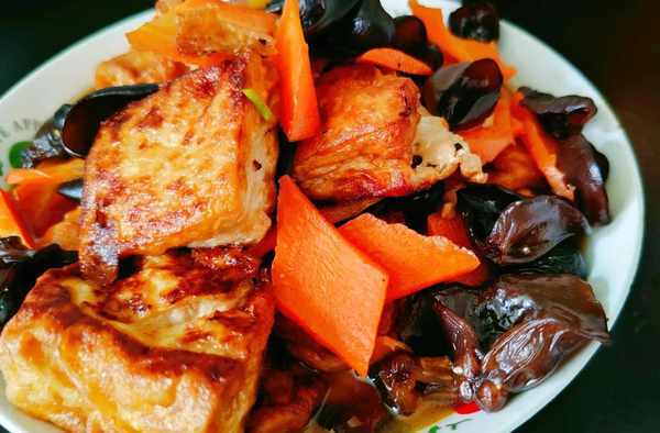 5,再起锅烧油,油热后,放入姜丝爆一下,倒入胡萝卜片和木耳翻炒均匀,倒入煎好的豆腐翻炒均匀,倒入适量的酱油、味极鲜和盐翻炒一下,倒入兑好的淀粉水勾芡,即可出锅装盘食用。