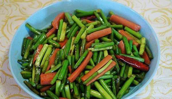【火腿肠炒蒜薹】很清爽的一道菜,简单不油腻,蒜苔的营养价值非常高,含有辣素,其杀菌能力可达到青霉素的1/10,对病原菌和寄生虫都有良好的杀灭作用,可以起到预防流感、防止伤口感染、治疗感染性疾病和驱虫的功效,在防冠这个特殊时期应多吃,和香肠搭配既好看又好吃。