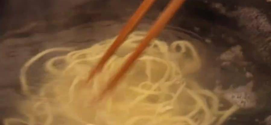 面片醒发好后开始制作,左手拉过去拉成螺旋状,切好以后,左手下右手上转2~3圈慢慢撑开,反手再撑开,去掉头尾,这样做出来的面条非常的好吃又劲道,水开以后放入面条,轻轻拨开,等水煮沸以后放入一小碗冷水,再次煮沸捞出。