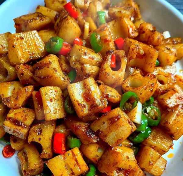 4.放入青红椒,加入一勺生抽,少许老抽和食盐,再加入一勺孜然粉,一勺白糖,大火翻炒均匀出锅。这款藕丁香辣开胃,特别费米饭。