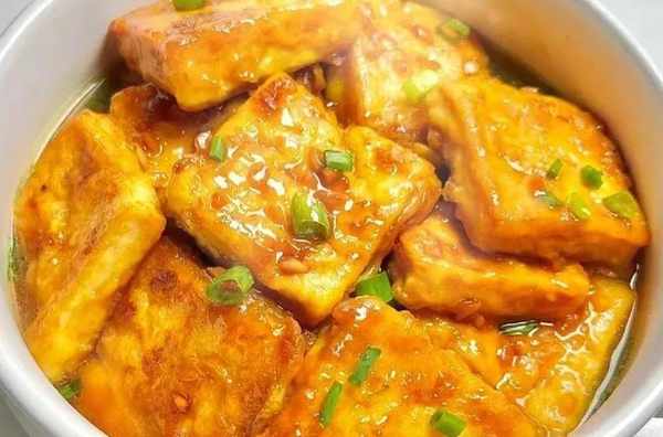 3.锅中倒入少量食用油,一片片放入煎至两面焦黄,倒入酱汁,大火收汁,撒上小葱花,豆腐滑嫩,咬一口软软嫩嫩,老少皆宜。