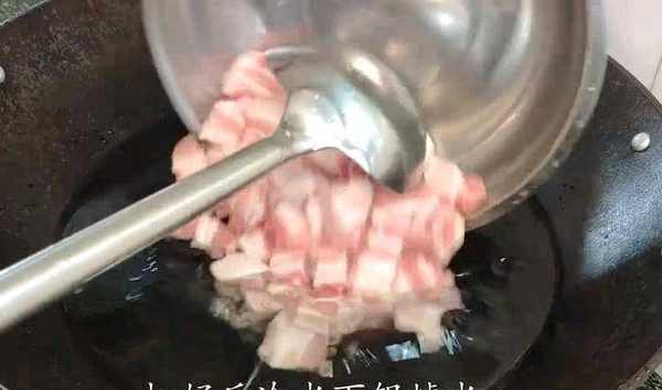 用中小火持续搅动,炒至香油色,下入五花肉翻炒均匀。