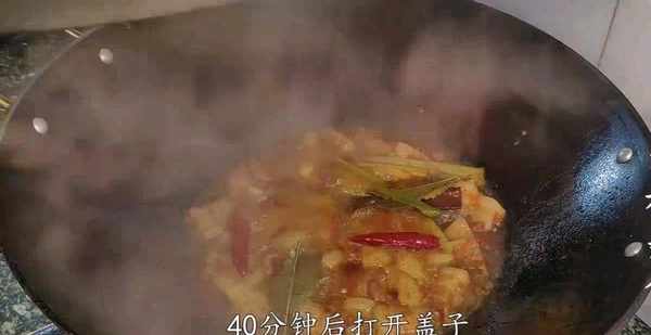 再放入准备好的香料,搅动一下盖上盖子,先用大火煮沸,然后转小火炖煮40分钟。