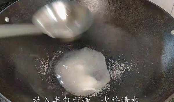 起锅先炒一个糖色,放入半勺白糖,少许清水。
