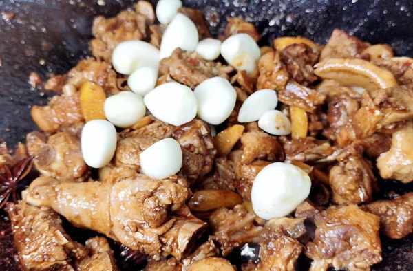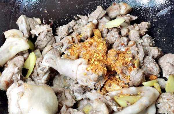 然后下八角、草果和鸭肉,多翻炒,把鸭肉的水分和油炒出来,一直把鸭肉炒到鸭肉缩小、紧实,表皮有点焦黄,