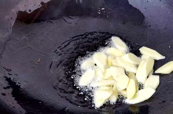 把锅洗干净,热锅下油,油温6成热下生姜片炒出香味,