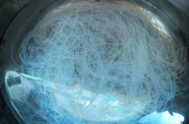 1、泡发粉丝:半卷细粉丝放在35度温水中泡8分钟。水温不能过高,40度刚好泡发,还劲道,不会粘连。