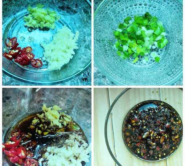 3、调酱汁:2个蒜头拍成蒜蓉,姜块切成姜末,朝天椒切碎,小葱切碎。放2勺生抽和黄豆酱油在碗中,放少许盐和花椒粉。接着放蒜蓉姜末,再放2勺冷水,搅拌均匀。
