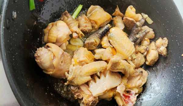 3,起锅烧油,放姜片爆香,倒入控好水的鸡肉煸炒上色,然后下入八角桂皮,香叶,花椒,葱蒜爆出香味。倒入没过鸡肉的开水,然后放生抽,老抽,白糖,鸡精,胡椒粉进行调味,盖上盖子闷煮25分钟