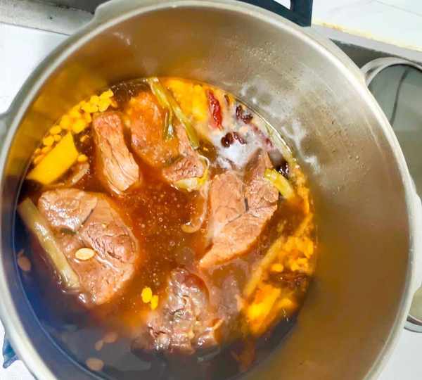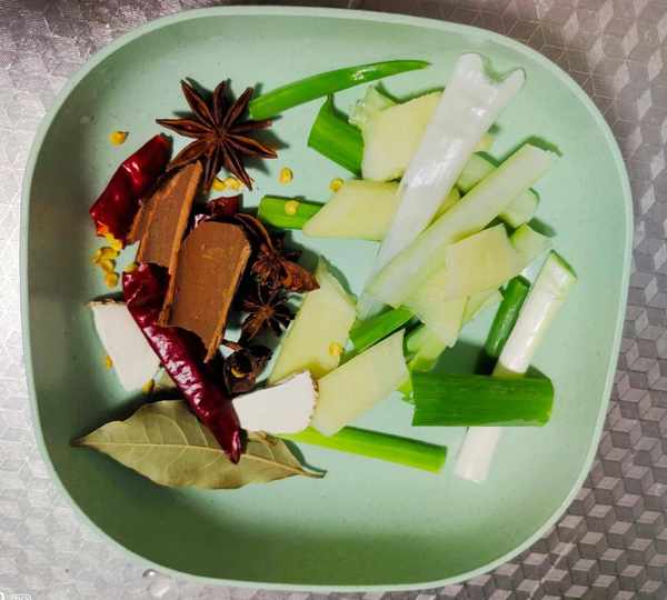 食材:牛腱子肉,油,盐,生抽,老抽,冰糖葱和姜,白酒,白芷,八角,桂皮香,叶干辣椒,黄豆酱