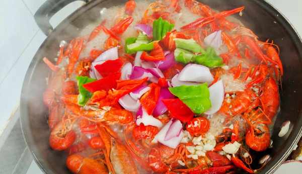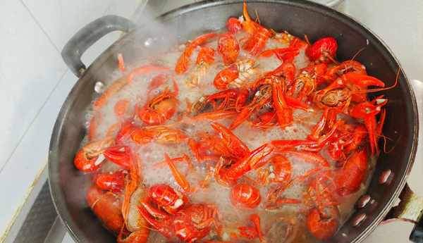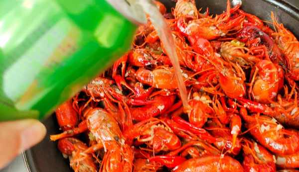 5、再次起锅烧油,放入姜片爆香,然后再下入炒好的蒜泥,炒出蒜香味,下入炸好的龙虾炒至均匀,放一瓶啤酒,适量清水盐鸡粉进行调味,盖上盖子焖煮15分钟。