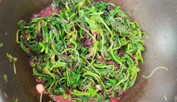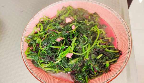 2、起锅烧油,放入花生油,然后再放入蒜末炒出香味儿,放入控好水的苋菜炒至均匀,开始调味放盐,鸡粉,白糖,继续炒至120秒就可以出锅了,端午节必吃五菜之首红苋菜,你今天吃了吗?