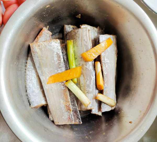 开始制作:1、把冷冻的带鱼侵泡半个小时,去除内脏,洗干净,沥干水分,加盐,胡椒粉,葱,姜,搅拌均匀,腌制十分钟
