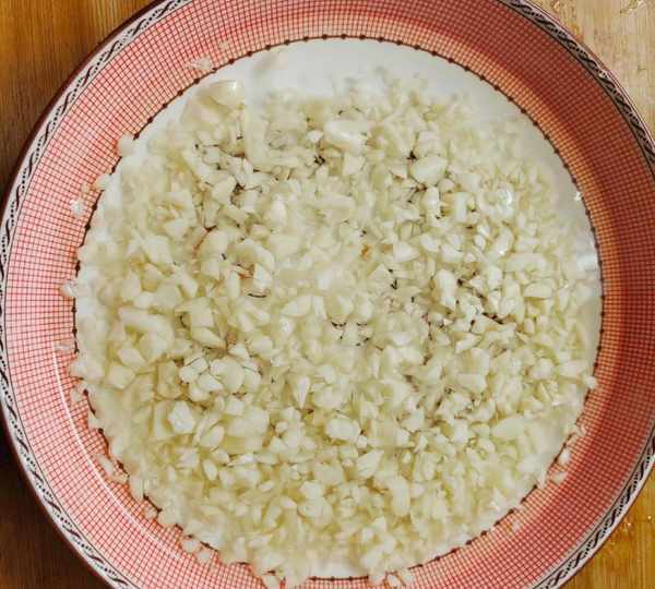 2、大蒜要多一点切成蒜末,分成两份,其中一份用清水淘洗,另一份备用,