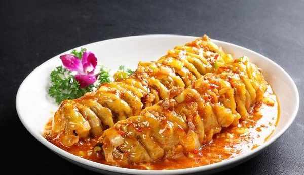 4.另用锅放25克油加热后,用葱姜蒜炝锅,再放入番茄酱炒熟,倒入150克鲜汤,随之加入白糖、盐、醋等调好口味,汤沸时用水淀粉拢芡,芡熟时倒入炸好的茄条颠翻至挂满芡时,淋明油、麻油出锅装盘。