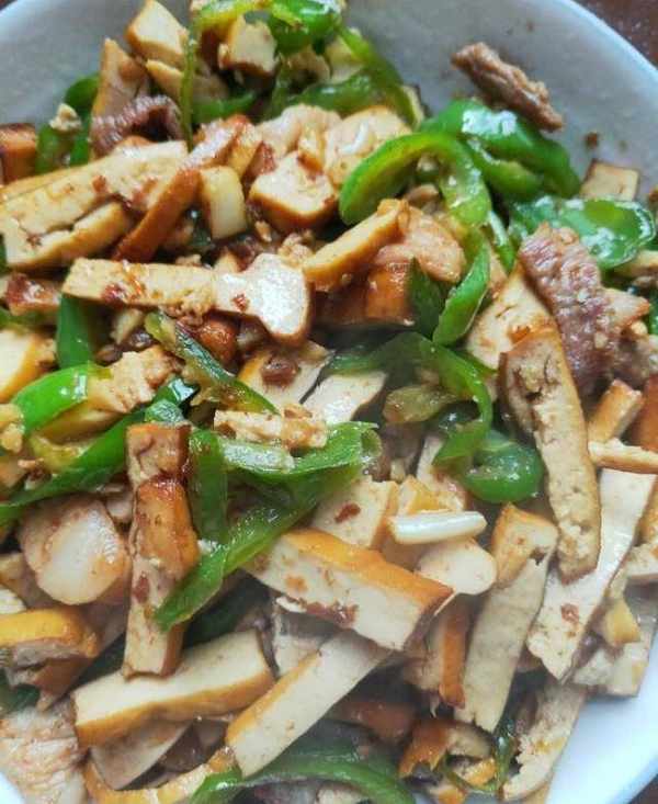 6.再放青辣椒丝一起炒软,倒入香干丝、生抽、蚝油、盐翻炒一分钟即可。